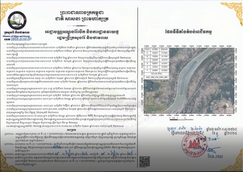 បើយោងតាមច្បាប់ប្រកាសរបស់ក្រសួងរ៉ែ និងថាមពលស្ដីពីលក្ខខណ្ឌនៃអាជ្ញាប័ណ្ណអណ្ដូងរ៉ែ និងបើកការដ្ឋានវាយថ្ម (សម្រាប់អាជីវកម្មខ្សាច់) គឺបានសម្រេចឱ្យសហគ្រាស ខេធី អ៊ិនធើប្រាយ (KT ENTERPRISE) ធ្វើអាជីវកម្មខ្សាច់ស្ថិតនៅតាមដងទន្លេមេគង្គ ក្នុងឃុំព្រែកដំបូក ឃុំស្វាយខ្សាច់ភ្នំ ស្រុកស្រីសន្ធរ និងឃុំខ្ចៅ ស្រុកកងមាស ខេត្តកំពង់ចាម នៅលើផ្ទៃដីទំហំ ៨៩ហិកតា គឺមិនបានបញ្ជាក់ថា អនុញ្ញាតឱ្យធ្វើអាជីវកម្មខ្សាច់នៅក្នុងក្រុងអរិយក្សត្រ ខេត្តកណ្ដាលនោះឡើយ ហើយទីតាំងនេះមហាជនបានឱ្យដឹងថា មានច្បាប់តាំងពីកាលក្រុងអរិយក្សត្រ នៅជាស្រុកល្វាឯម តែពេលបង្កើតក្រុងអរិយក្សត្រមក គឺមិនដែលបានសុំច្បាប់នោះទេ ចំពោះសាឡង់បូមខ្សាច់ស្ថិតនៅចំណុចសង្កាត់ស្វាយជ្រំមាត់ទន្លេឮសំឡេងខ្លាំង ធ្វើឱ្យរំខានដល់ប្រជាពលរដ្ឋដែលរស់នៅក្បែរនោះយ៉ាងខ្លាំងធ្វើឱ្យពួកគាត់មិនសប្បាយចិត្ត។