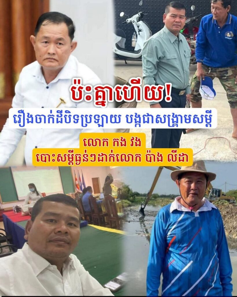 ចំពោះការប៉ះគ្នាជាមួយលោក កង វង គឺដោយសារតែលោក ប៉ាង លីដា អភិបាលរងខណ្ឌពោធិ៍សែនជ័យ សហការជាមួយផ្នែកជំនាញពាក់ព័ន្ធចុះពិនិត្យមើលការចាក់ដីខ្សាច់បិតប្រឡាយទួលពង្រទី១ សង្កាត់ចោមចៅទី១ ហើយការធ្វើរបងគ្មានច្បាប់ទម្លាប់ ទើបលោកប៉ាង លីដា ទទួលបានព័ត៌មាននេះ ក៏ចុះពិនិត្យមើល និងវាស់វែងជាមួយផ្នែកជំនាញ ហើយឃើញមានការចាក់ ដីខ្សាច់បិតប្រឡាយ និងរៀបចំសាងសង់របងថ្ម មិនទាន់មានច្បាប់ពីក្រសួងពាក់ព័ន្ធ។